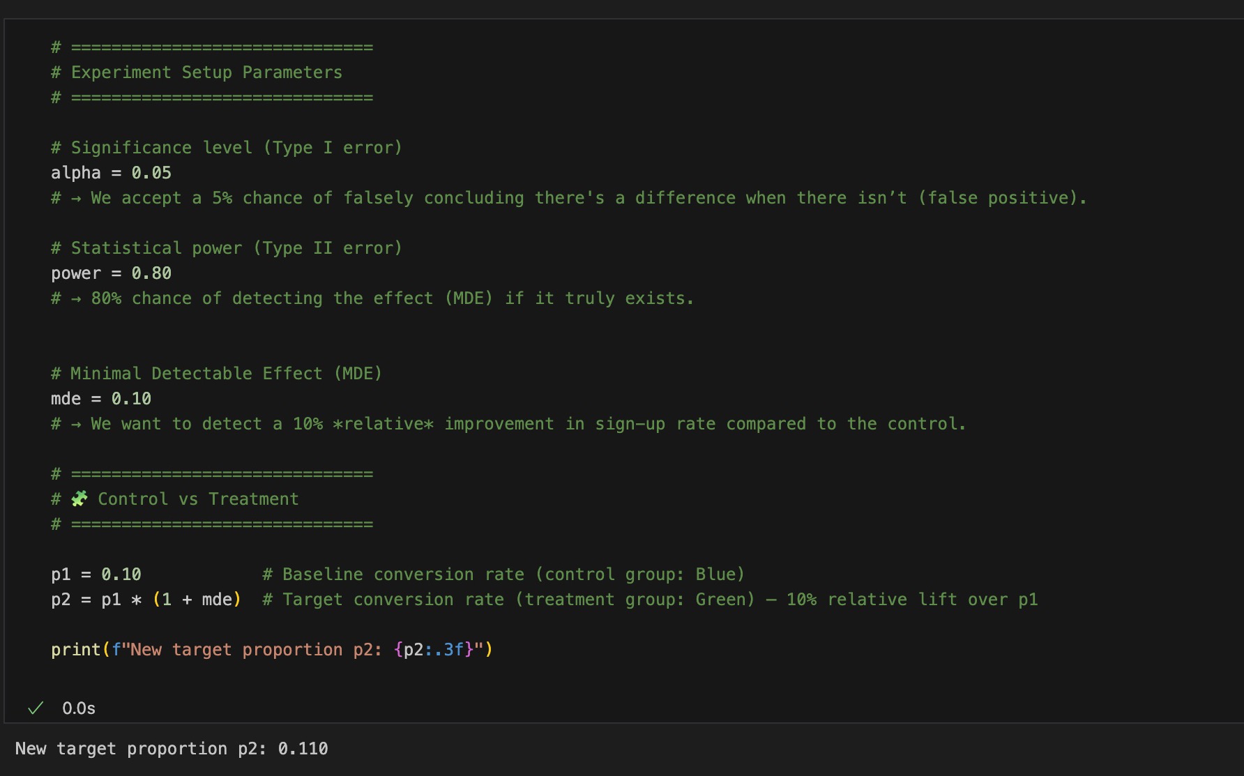 As you can see on the left, the proportion of users who sign up (p₁) is 0.10 . We aim to increase this proportion by 10%, which defines our Minimal Detectable Effect (MDE).